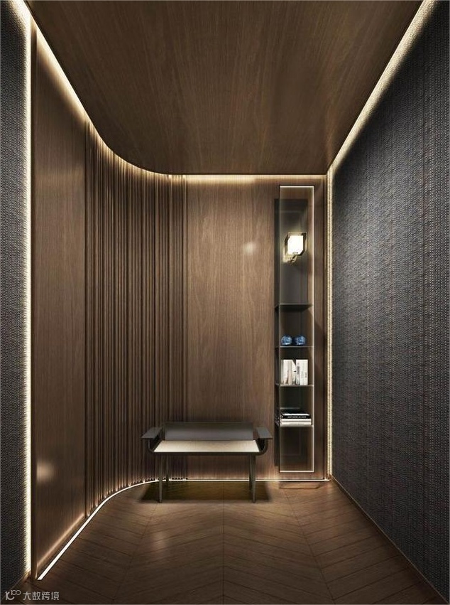 墙板与壁布的收口形成错台,加入灯带。