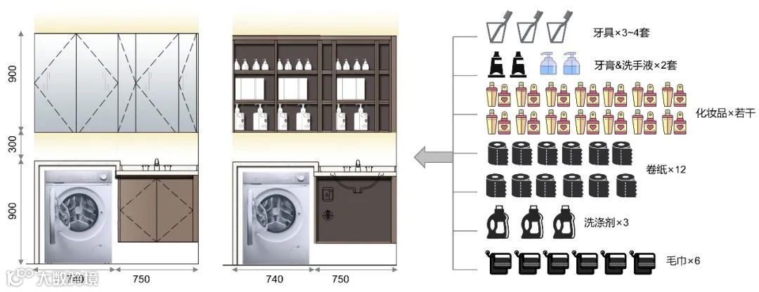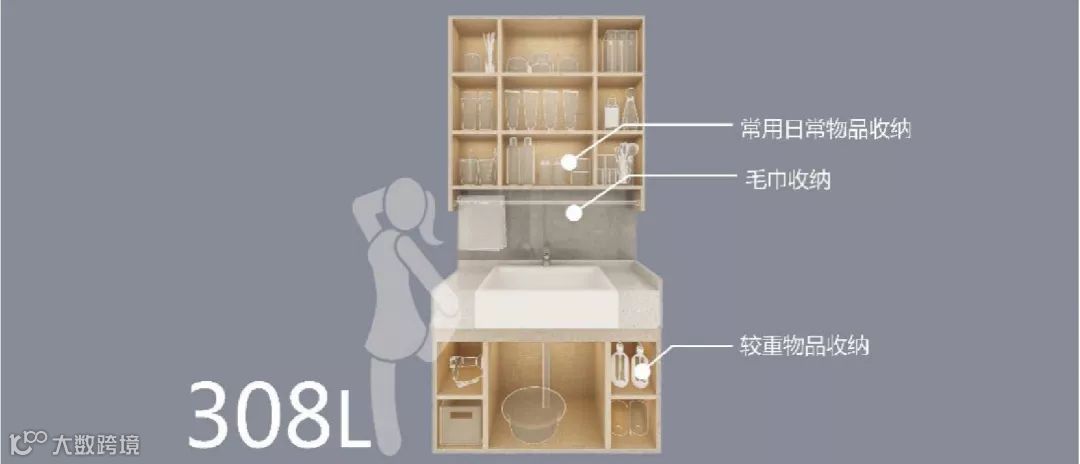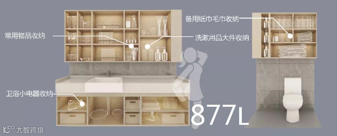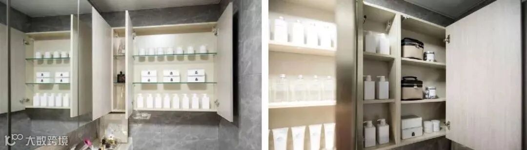 主卫收纳分为镜柜、地柜、拓展三部分,采用日式收纳细分的方法,满足日常使用和备货存储,女性客户的各种化妆品及美容小电器可以收纳其中。