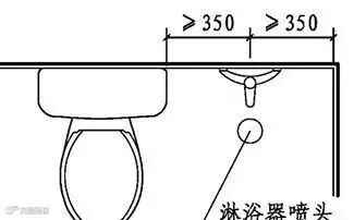 4、淋浴器喷头中心距墙不应小于350mm。喷头中心与低位洁具水平距离不应小于350mm(下图)。