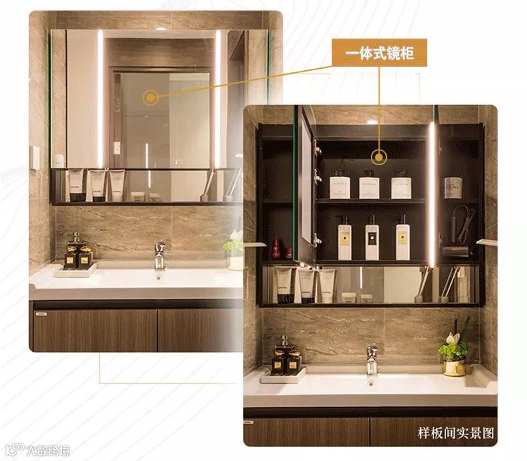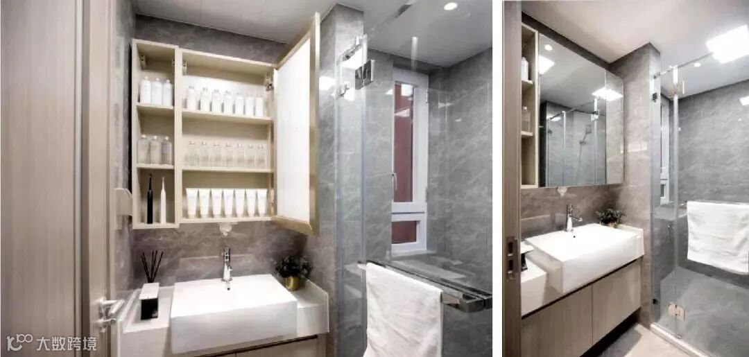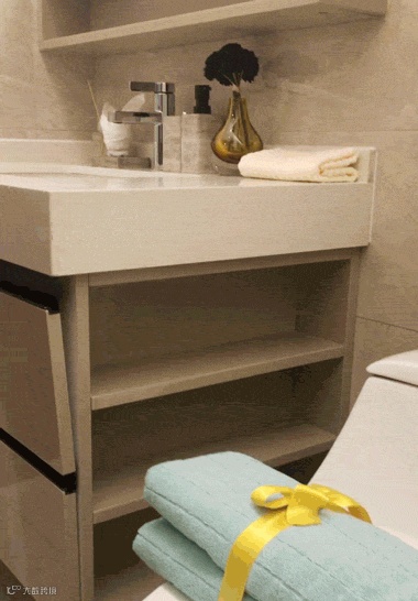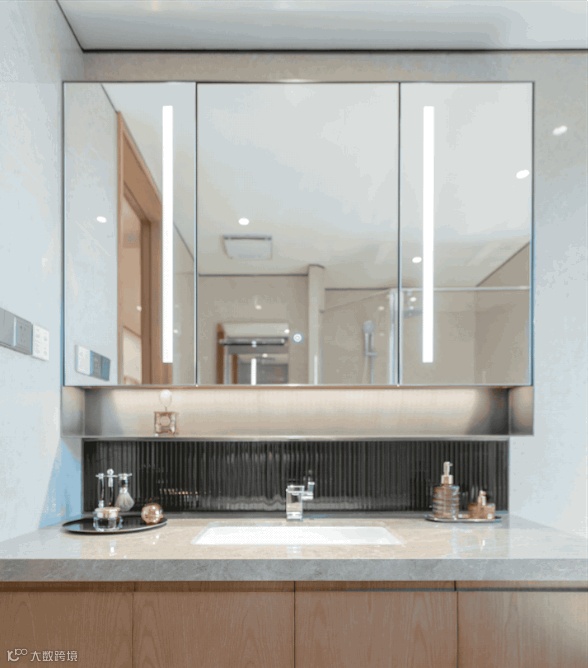 但是镜柜最好是坚持二八原则——20%露,80%藏。为什么呢,如果采用全封闭式的,很多住户长期会觉得开关镜柜门拿东西超级麻烦,反而会将物品直接放在台面上,镜柜留有20%的半开放式,用来收纳常用护肤品,其他隐藏在镜柜内部,才更满足收纳需求。