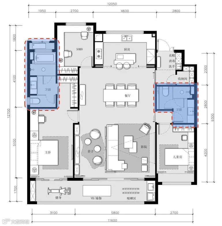 如下图主卫、公卫分离成独立的洗漱台、马桶间和淋浴间,三个人同时使用,互不干扰。