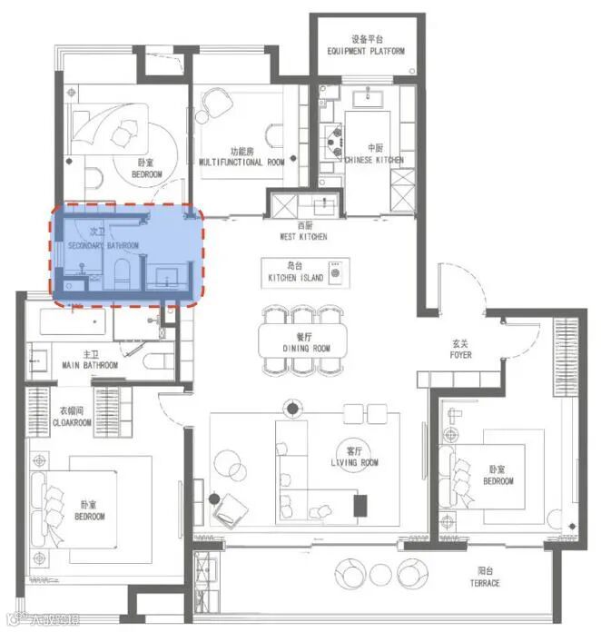 优点:各室可以同时使用,特别是在高峰期可以减少互相干扰,各室功能明确,使用起来方便、舒适。洗衣机一般会考虑放置在此类空间内。关注经典人居