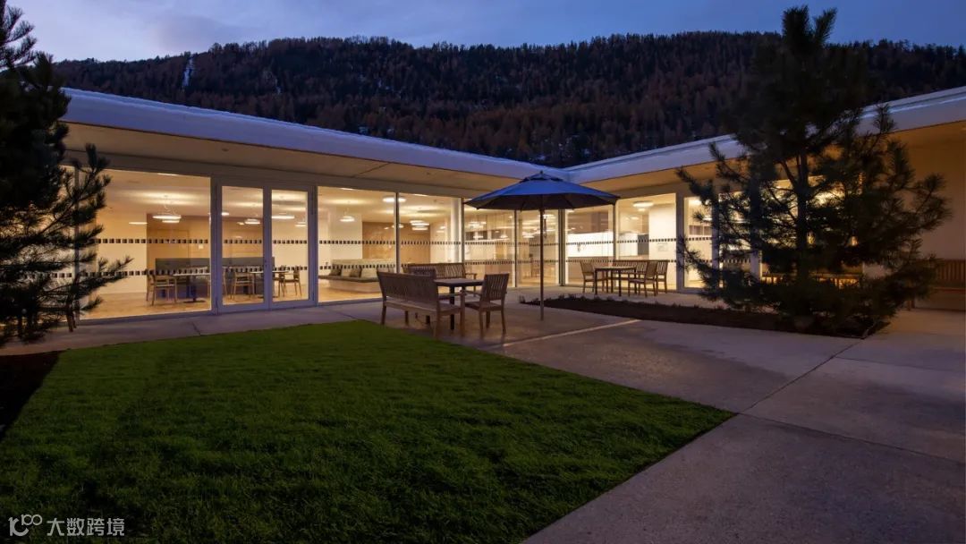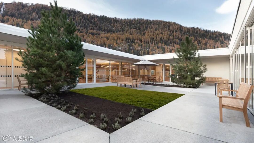 这家疗养院被称为奥地利“临终关怀的天堂”,占地面积为2600 m²,这座单层整体建筑自如地延展在绿地之中。设计围绕中庭,设置了33间单人疗养室,每间疗养室都可直接进入中庭,内中庭设计优化了建筑的通风采光效果,也方便老人交流沟通。