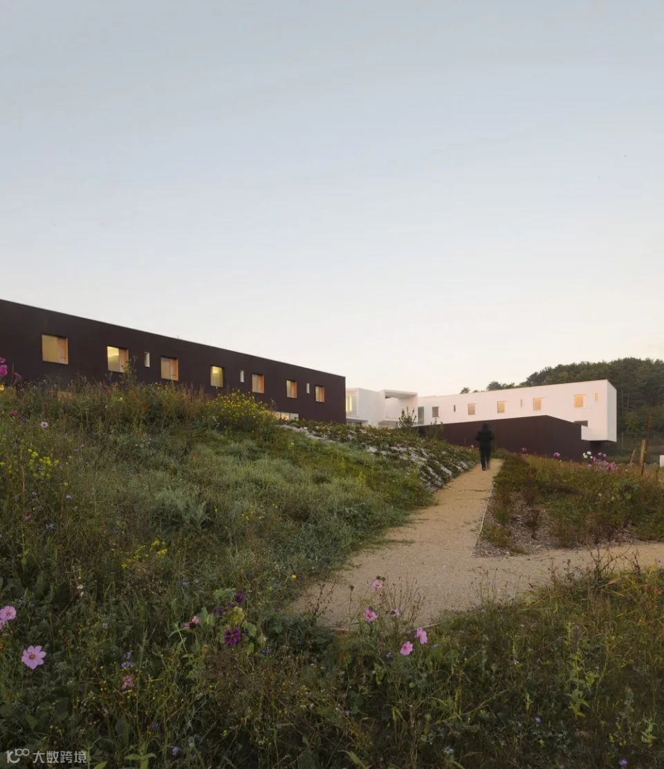 这座位于法国Pont-sur-Yonne的老人院与周边坡形的景观融为一体。深色的建筑体量内容纳着96个房间。建筑的主入口前面是一个面向村子的小广场。