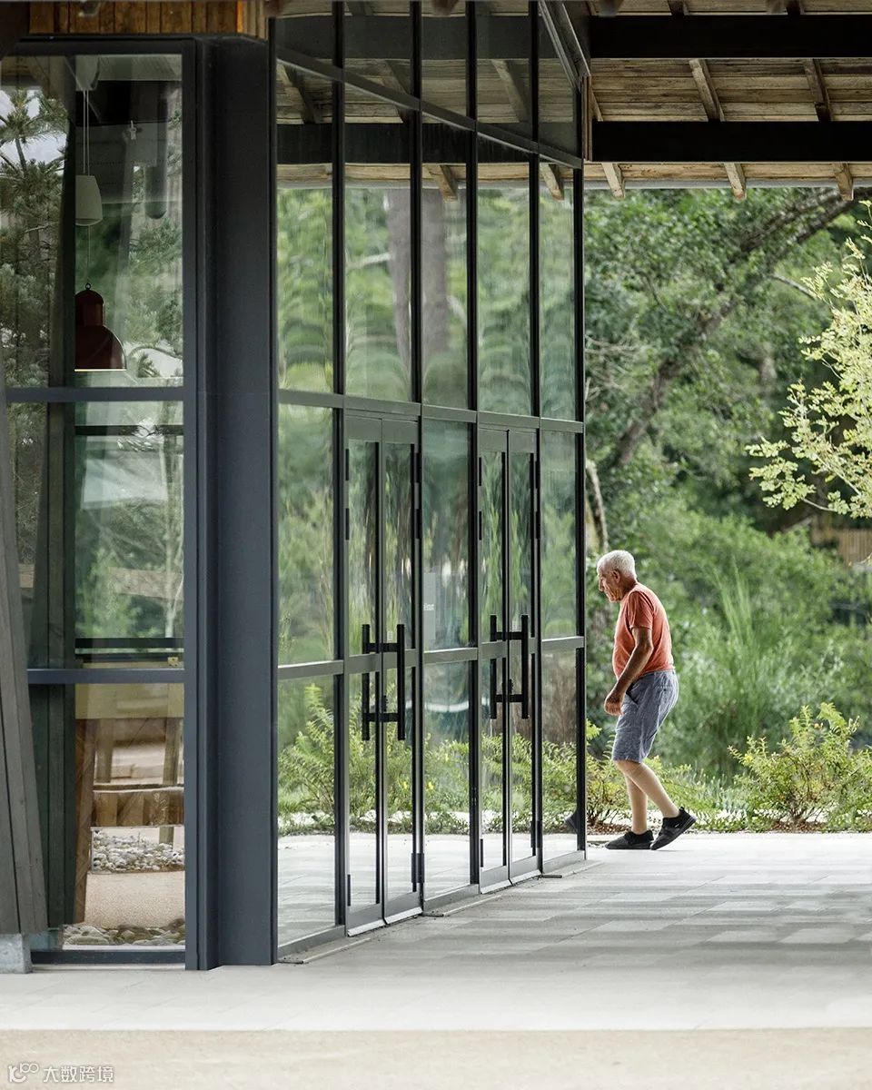 感官设计也体现在了空间内外和景观的设计上。材料的选择以触感、气味和色彩对比为基础。它们暴露在空气和时间的流逝中,扶手在人们的触摸中快速改变,石头的变化则要缓慢的多,木材最终会呈现为灰色。退休环境下,时间对于使用者来说尤为珍贵,对时间的感知可以为精神和身体健康带来许多益处。