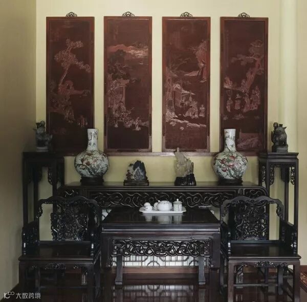中国传统客厅的家具布置多为严格对称的布局,即家具的种类、数量、形制、用材都相同或相近,沿 着房间中轴线对称陈设。这种端正、平稳的陈设布局,是恒定、规范的等级和社会性、公共性原则的一种体现。从另外一个