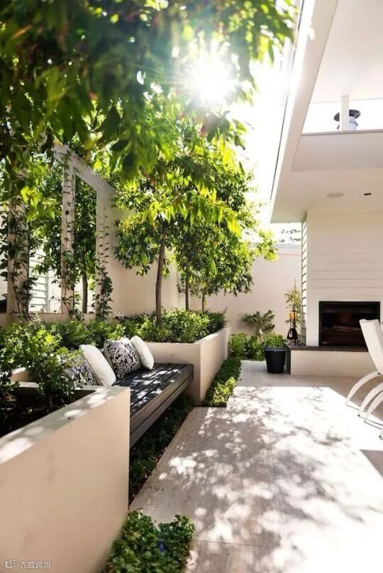 院子的边界区域则可以在不妨碍采光和通风的情况下,多种植高大的落叶乔木和花灌木,用来隔绝外界噪音的同时,也有利于保护私密性。