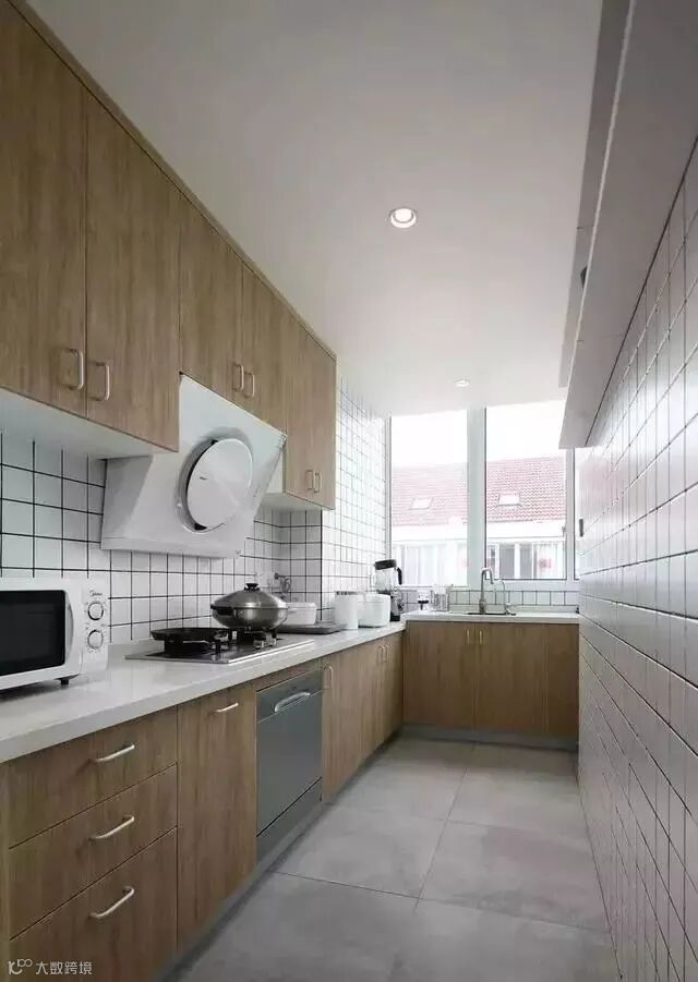 通过木色来提升厨房的温馨感,白色带来明亮感,灰色让厨房变得更有格调感。