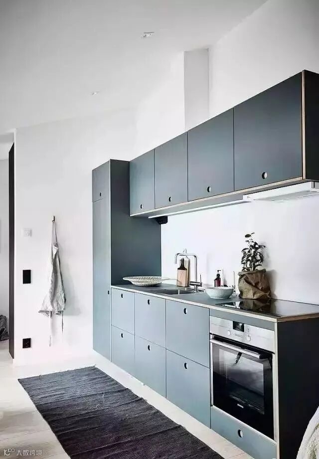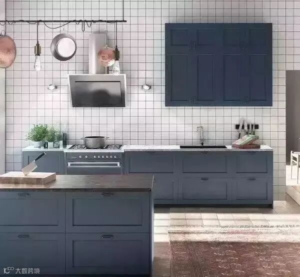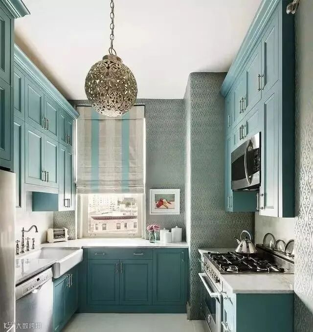 蓝色橱柜也很常见,但绝不是辣眼睛的荧光蓝,而是深蓝、蒂芙尼蓝,浅蓝,不同的蓝,演绎精彩斑斓的高颜值厨房。