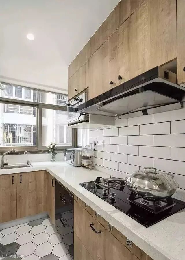 在厨房的墙面、地面铺设花砖、六边砖和仿古砖等等创意、文艺的设计,能够让厨房也变得更加清新和时尚,比起铺贴的小白砖、大理石瓷砖更加有趣。