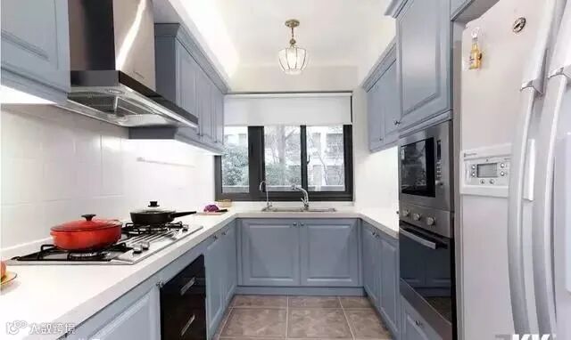 浅蓝搭配白一点的色调更适宜,打造厨房的高级质感。