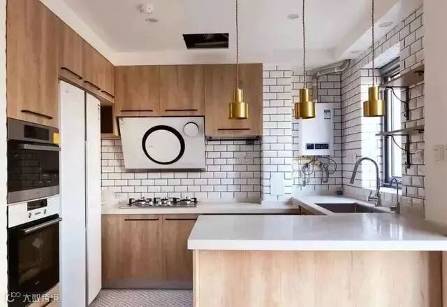 原木风的橱柜比较常见于北欧风的设计当中,温馨的木色柜体和白色的台面、小白砖结合起来,让人感觉厨房明亮而又舒适。