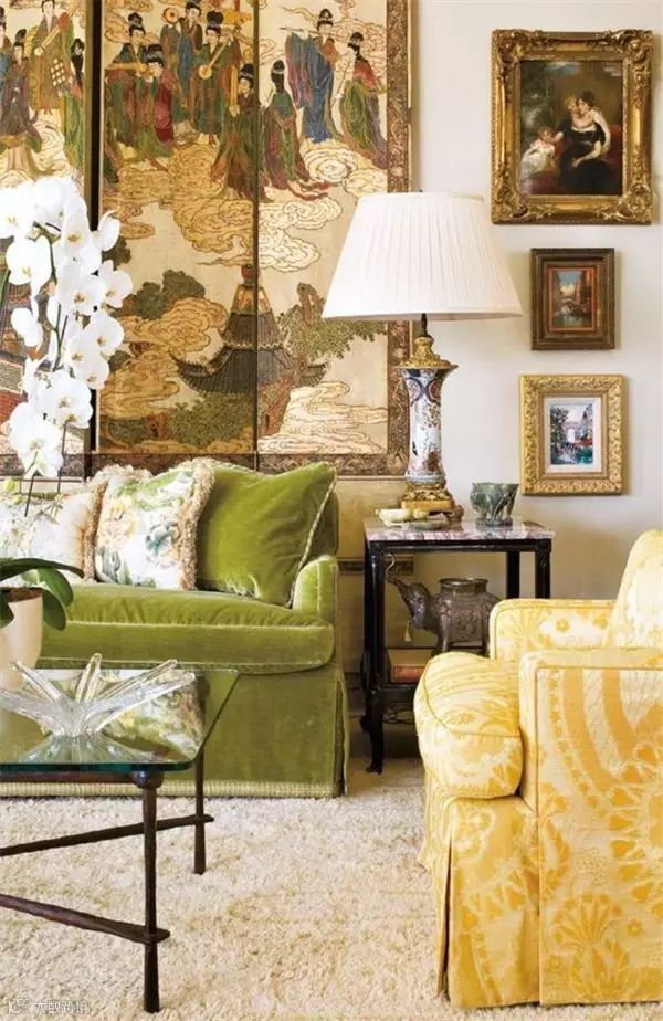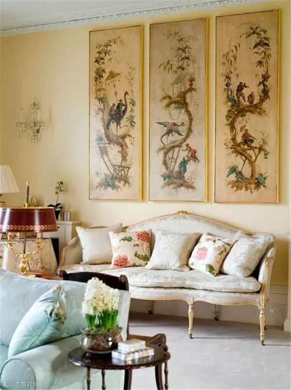 欧式沙发,中式花纹和壁画,雍容华贵。