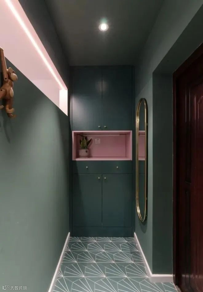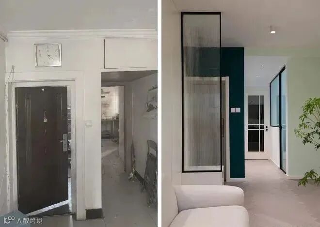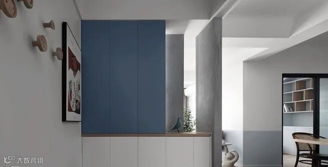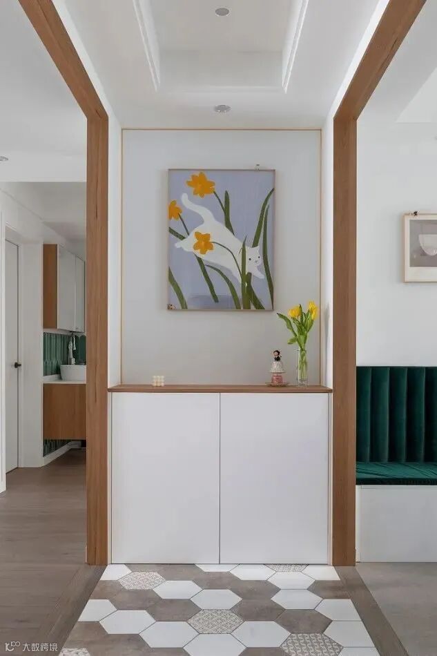 如果想搭配转运饰品可以考虑在门口砌墙,摆放开放置物架、半高的柜体、长桌等,既有装饰效果,又能有优化动线的功能。