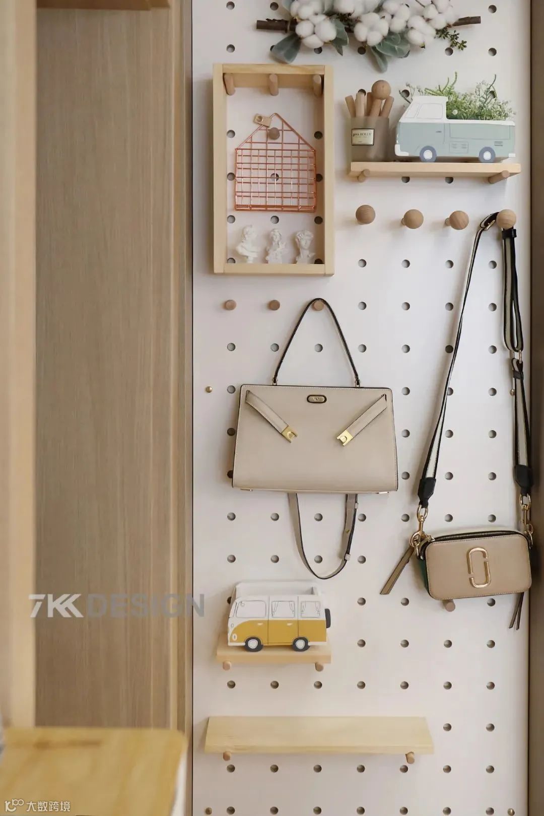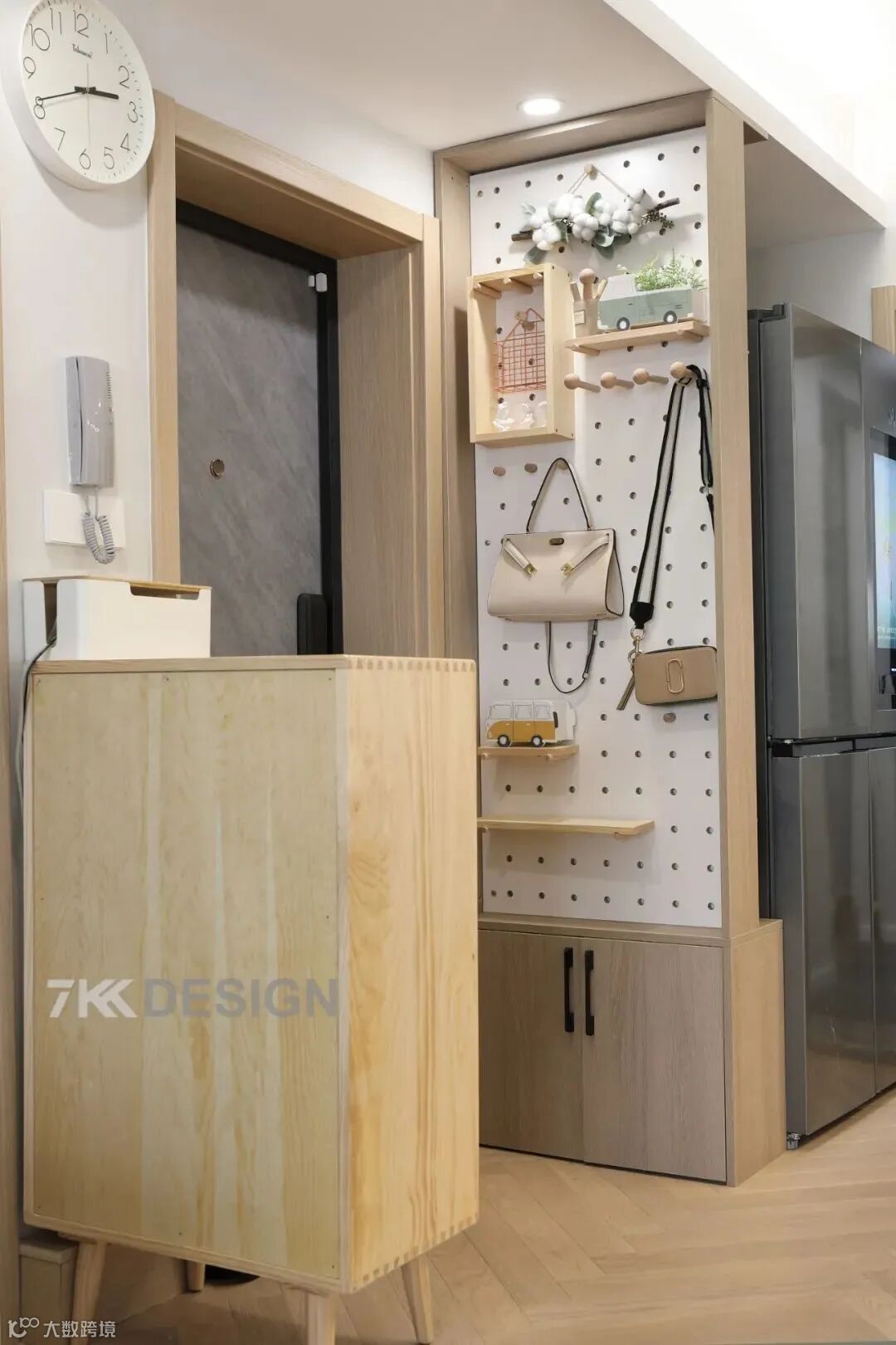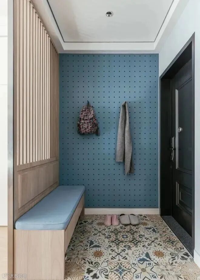 ②玄关柜布置的关键是要遵循37原则,留足挂物区和置物区,洞洞板和矮柜都是很好的选择。