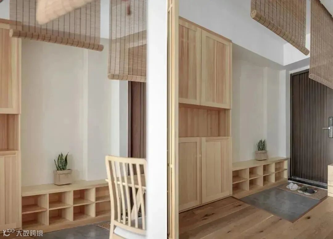 在硬性条件无法达标的状况下,可以选用超薄鞋柜配合开放格置物架,免打孔洞洞板等,人为制造出一个温馨、健康的玄关功能空间。