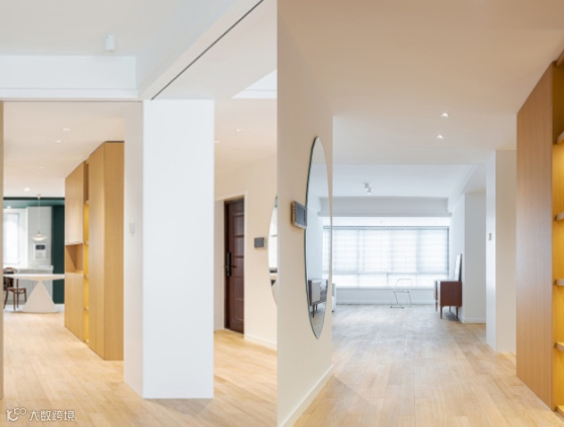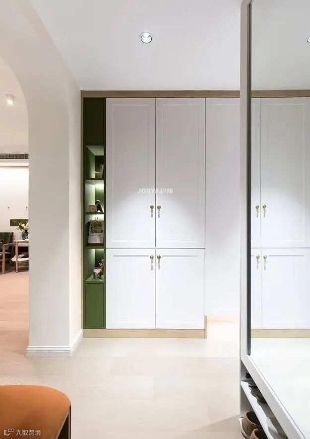只要在玄关处侧墙面留出贴镜子的空间,方便整理衣物即可,可以与玄关柜平行,方便出门换鞋后整理仪容仪表。