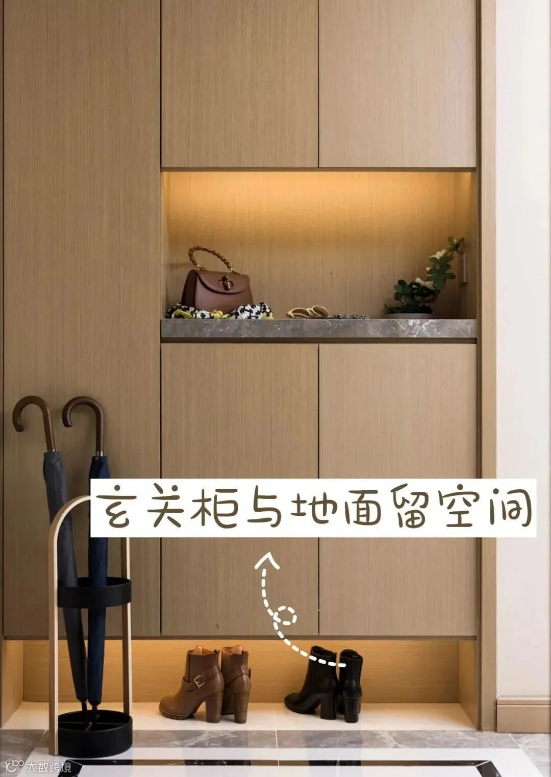 ③柜底尽量悬空,入户将鞋直接放在下面,留出主通道,减少进门“一脚鞋”的状况。鞋柜最好与地面留有空隙,常穿的鞋可以直接“踢进去”,既不显得脏乱还很方便,也有人将这个位置作为扫地机器人的收纳位。
