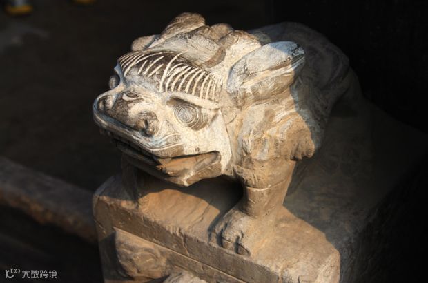 石雕上叭着招财的金蟾,只有三只脚,它很会吐钱,所以被当作旺财瑞兽。