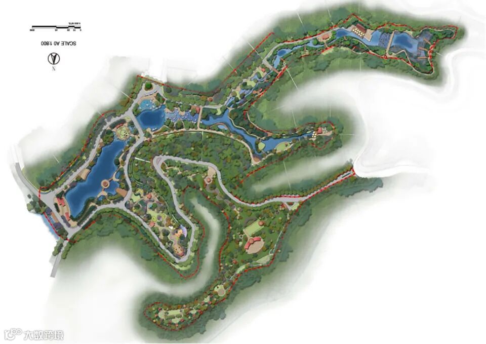 根据原场地条件,总体规划方向确定为“突出绿色旅行和生态休闲”,结合绿色生态环境和道家“天、地、人三和合”的养生理论, 以“山水园林路立体开发,农业与旅游配套建设”的思路开发。