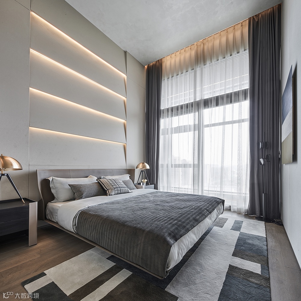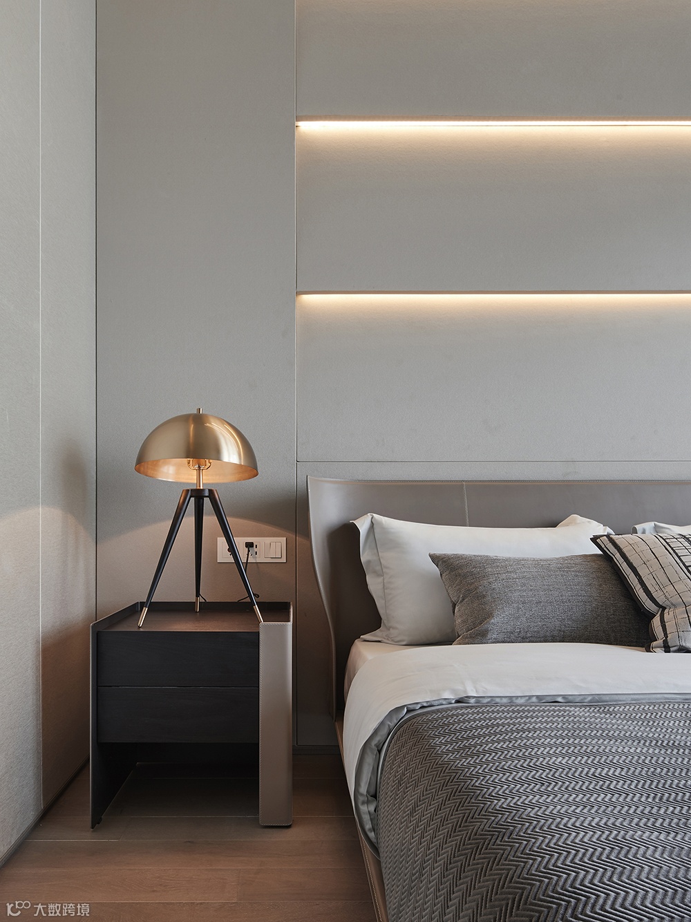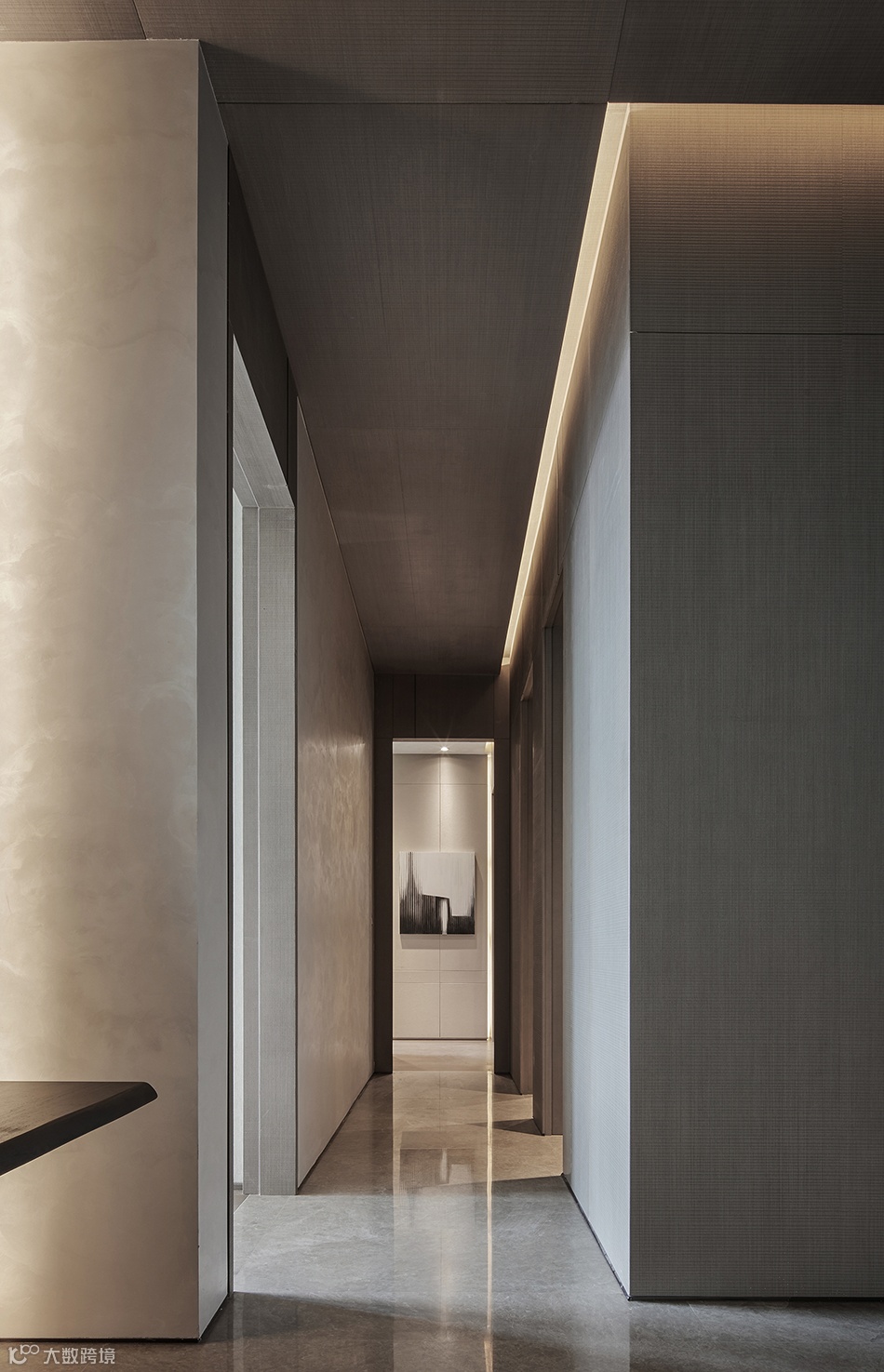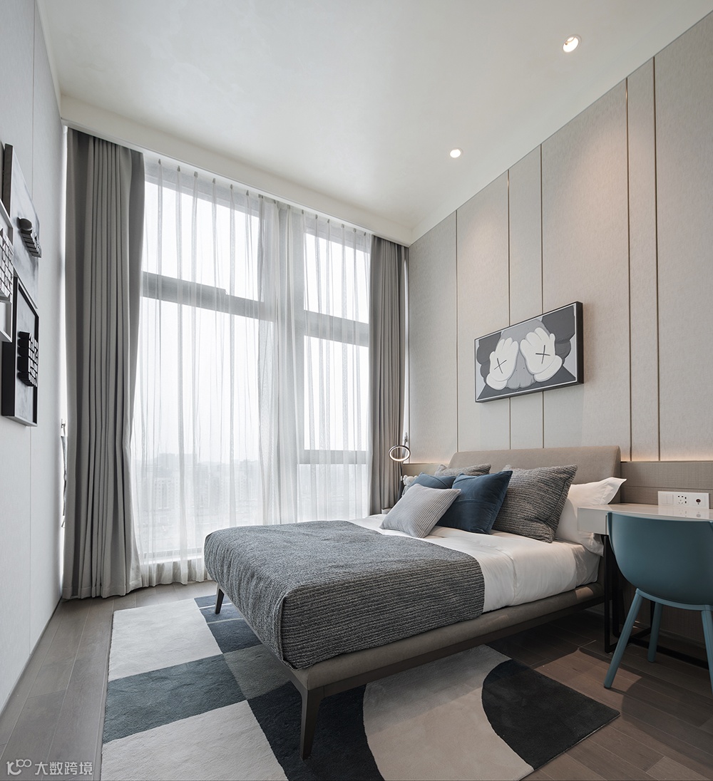 通过走道和客厅,客卧在房屋的另一端。墙面层叠的造型令人耳目一新,与主卧立面遥相应和,独立的卫生间与衣帽间为客卧的不同使用者提供了贴心的私人起居。