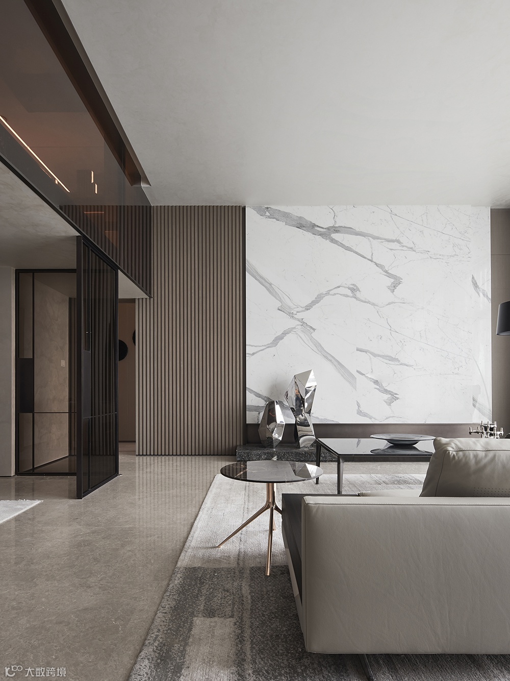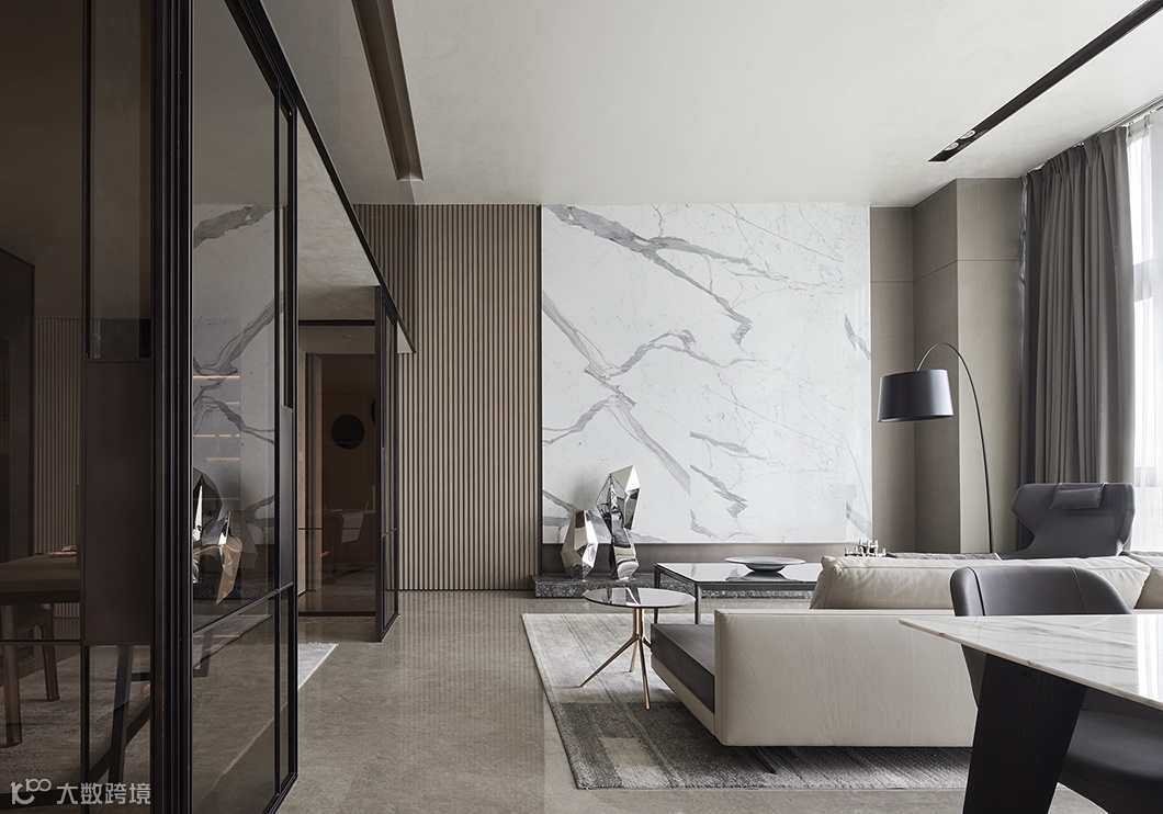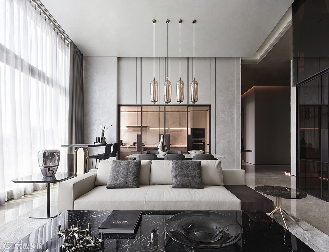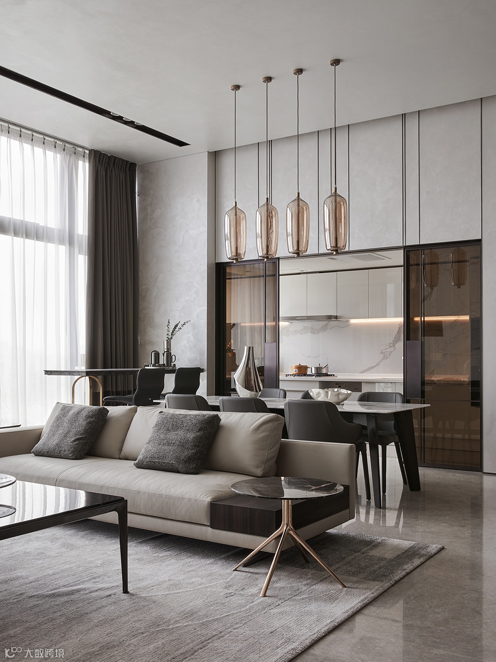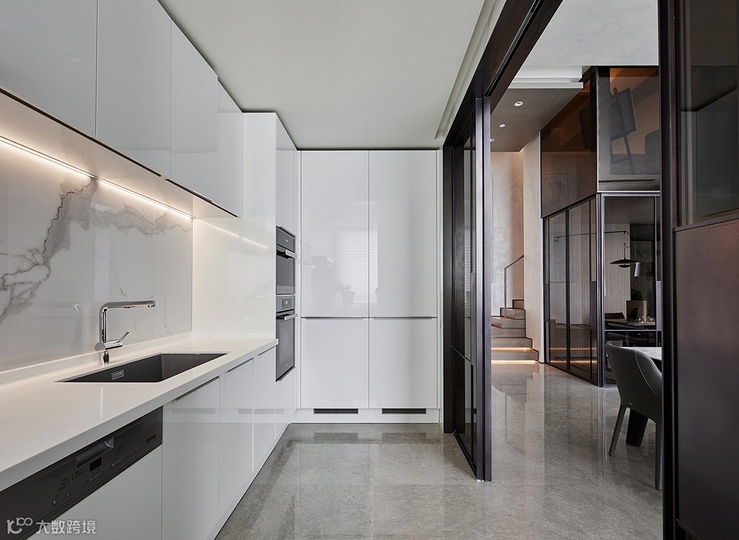 客厅后侧是厨房,格挡是采用深色玻璃制作而成的推拉门,内部整体为白色柜面,墙体呼应客厅背景墙,以爵士白大理石为装饰,优雅温厚,细节充盈。