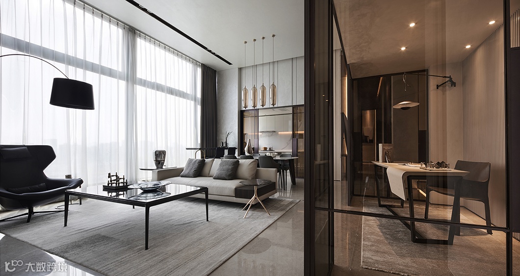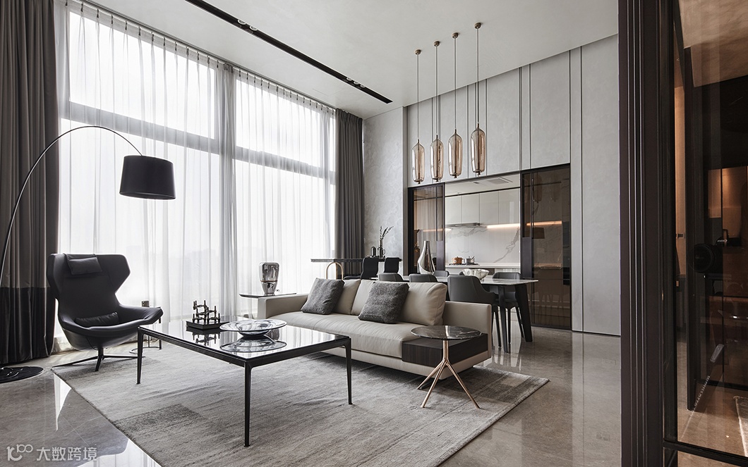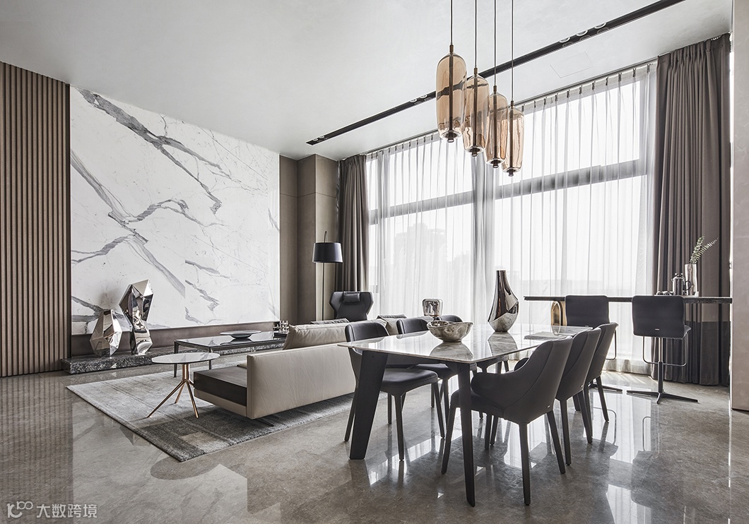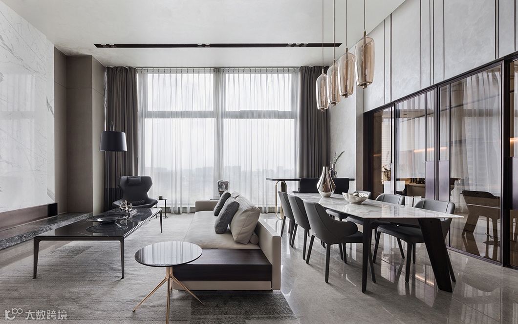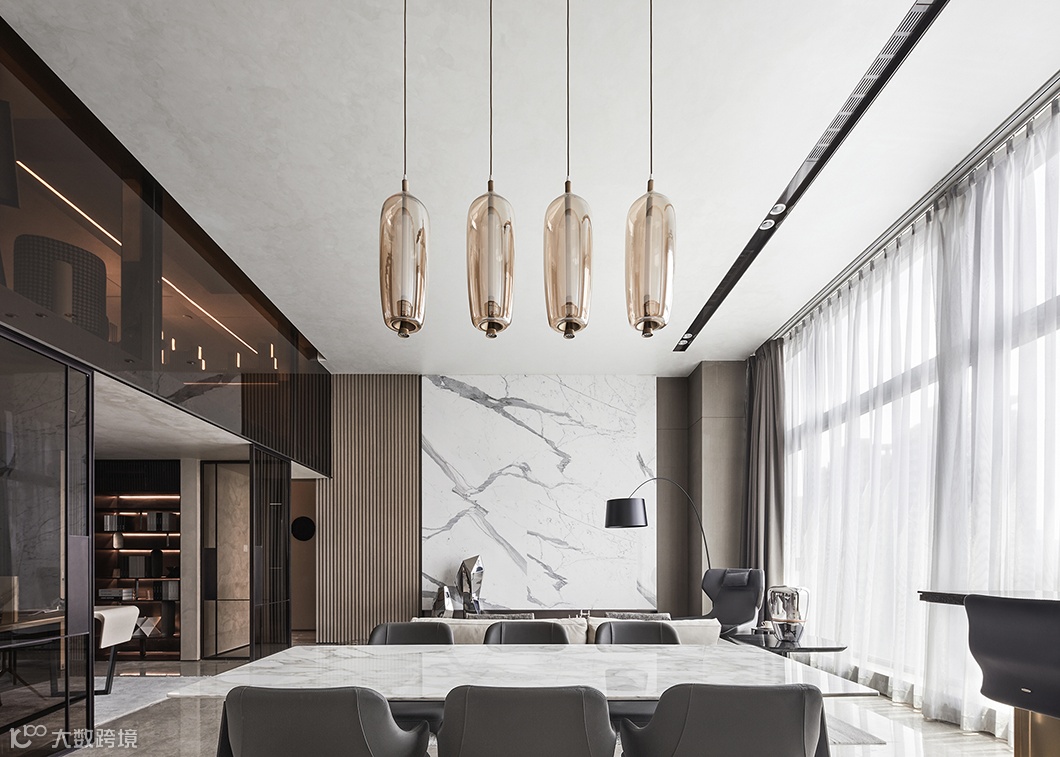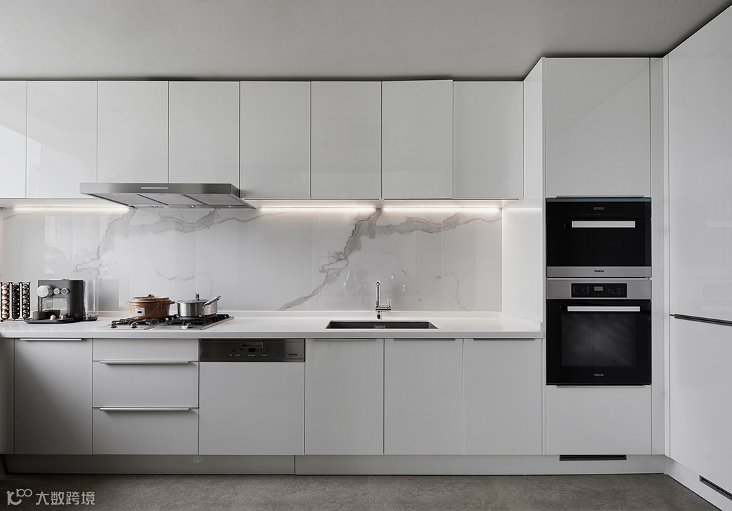 客厅后侧是厨房,格挡是采用深色玻璃制作而成的推拉门,内部整体为白色柜面,墙体呼应客厅背景墙,以爵士白大理石为装饰,优雅温厚,细节充盈。