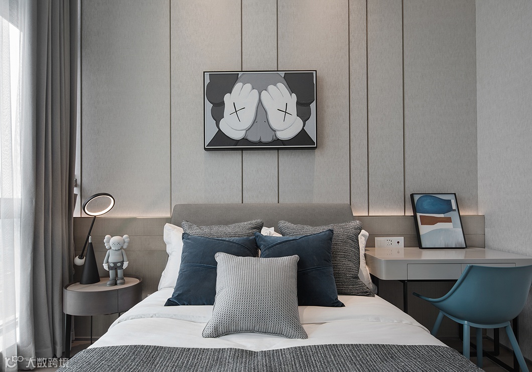 儿童房与主卧一墙之隔,蓝灰色调含蓄温和,简洁的布局使人舒适自在。