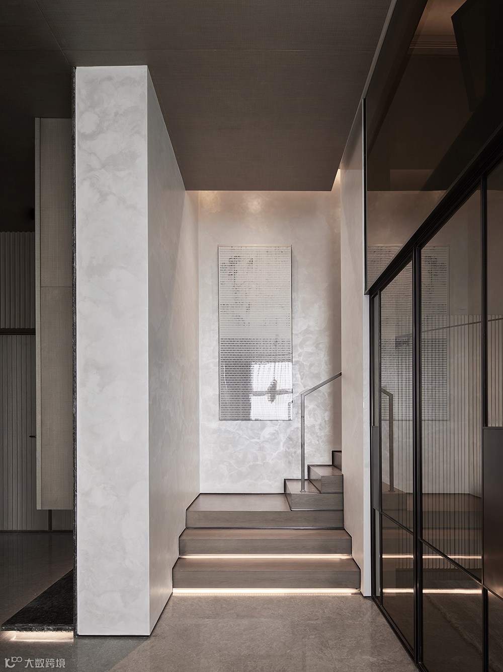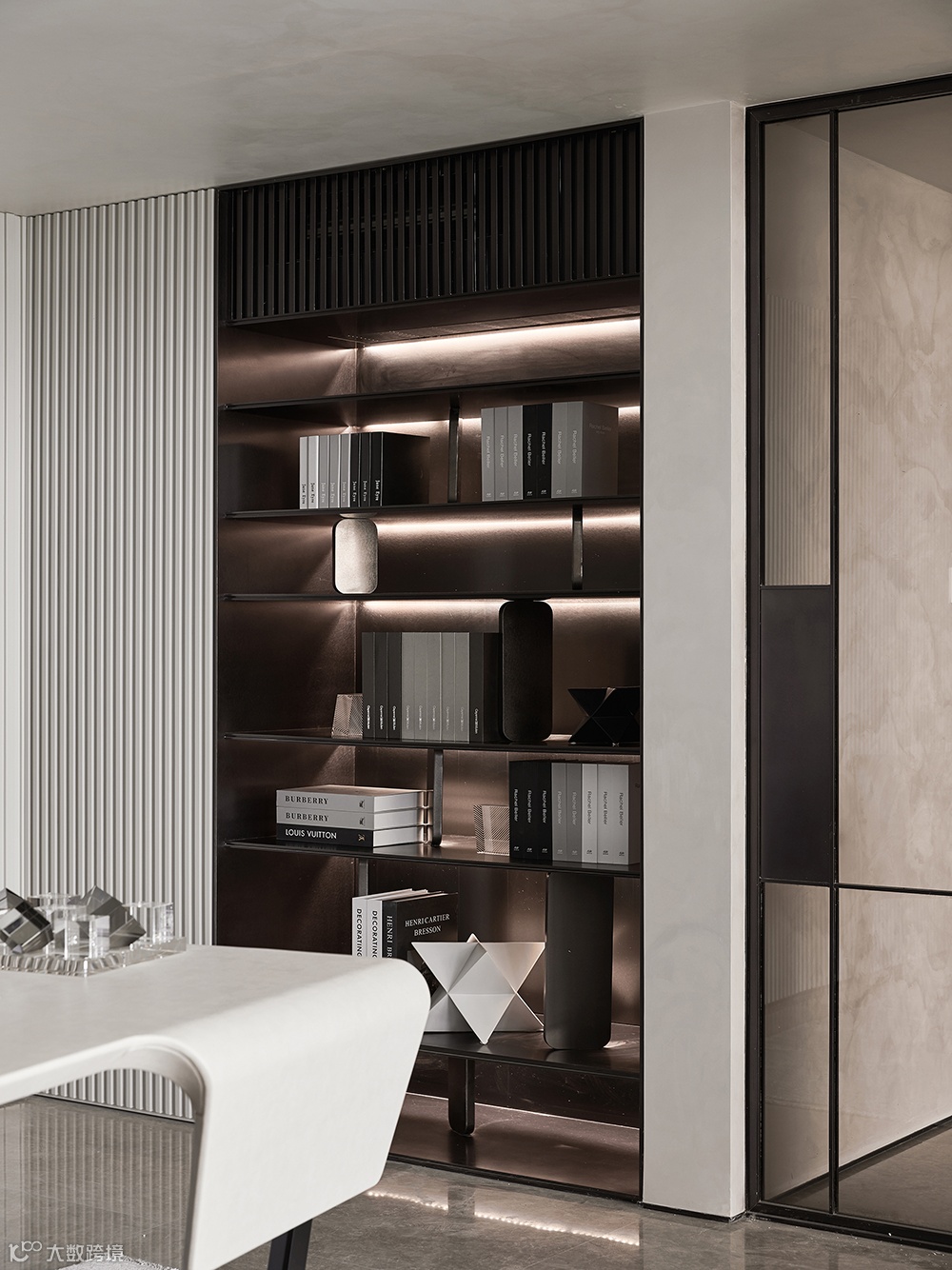 一层是书房,内部以白色条纹墙面为主,形式简约的展示柜别具一格。