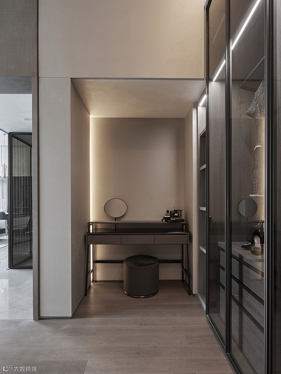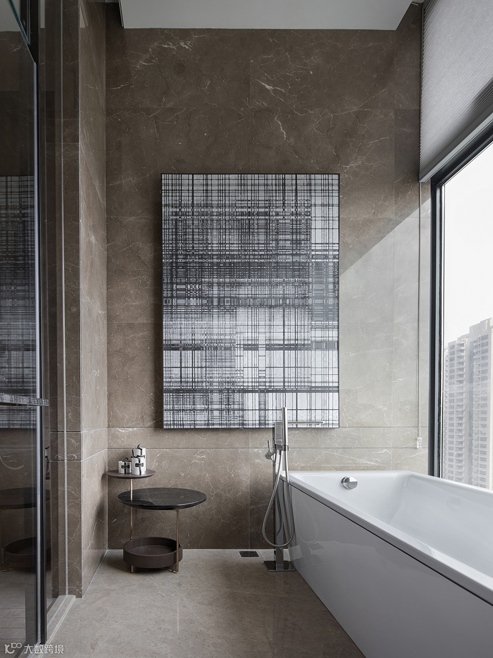 衣帽间在深色玻璃后方,浴室位于另一侧,靠近阳台的区域设有浴缸,灰褐色大理石与客厅空间相得益彰。