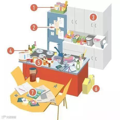 图中是个乱糟糟的厨房和餐厅。你的厨房收纳是否也有同样的苦恼呢?