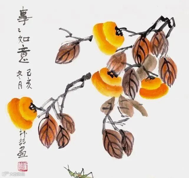 除了寿桃画的好,朴喆老师绘制的柿子图也深受藏家喜爱,柿子也是一种非常经典的吉祥题材,寓意着事事如意、万事大吉等,而且朴喆老师笔下的柿子形似如意,又似一颗颗金元宝,自然也有招财纳福的象征,并且这样金黄的色彩,也能够为我们带来丰收的喜悦,挂在家里也可以调节风水、改善家居气场,为家人带来好心情。如果你仔细观察,就会发现朴喆老师喜欢在画里点缀工笔昆虫,作为画中的点睛之笔,工笔昆虫不仅能够让画面观赏性大大提高,而且也让整幅作品“活了过来”,变得意趣生动了。