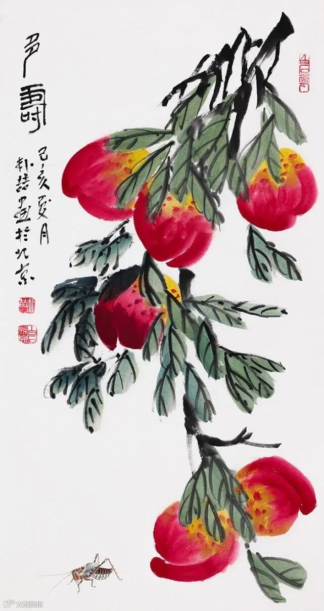 白石老人除了虾趣图画的好,他笔下的寿桃画也是非常有特色的,不仅白石老人喜欢画桃,藏家们也喜欢齐白石老人的寿桃画,朴喆笔下的寿桃,和她祖父的寿桃有着异曲同工之妙,但从这鲜艳的色彩上来看,就给人一种雅俗共赏的艺术感。画家笔下的寿桃不仅有艺术魅力,而且还有一种独特的美感,让人看了以后能够引起心灵的共鸣,这才是一幅好画所具备的必要条件。这幅寿桃画无论是挂在餐厅,还是客厅、书房,都可以起到一个很好的装饰效果,并且能够为家里带来长寿健康、吉祥如意的风水效果,同时也是挂在墙上就会升值的潜力股,是不是非常让人心动呢?
