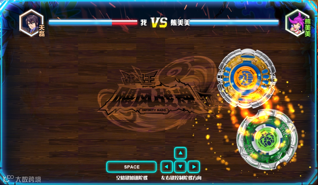 游戏可以通过键盘操控自己陀螺的旋转方向、位置,攻击或躲避对手。而且还能通过连续点击空格键的方法增加陀螺的攻击力,快速制敌。