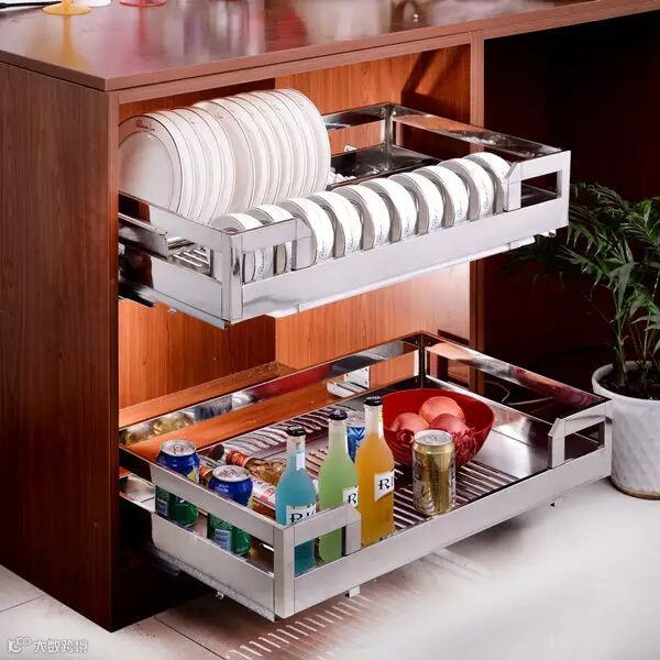 开放式拉篮,把橱柜空开一段,装上一个开放式的拉篮放蔬菜水果,下面放垃圾桶兼放抹布,实用又好看。关键是不仅增加了台面的空间,又省了一组地柜的钱,这些不能放在冰箱里面又不适合放在柜子里密存的蔬菜就有容身之处了。