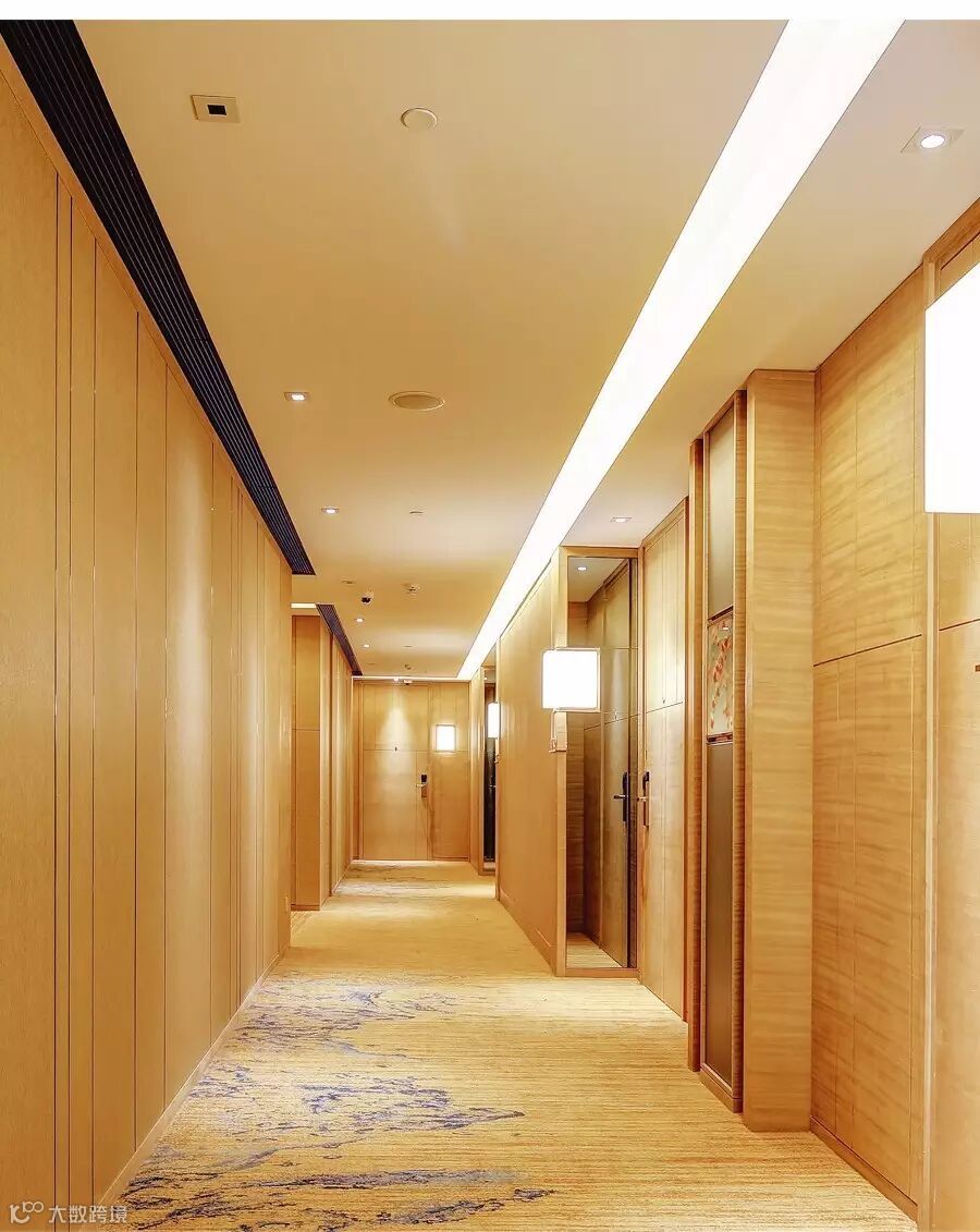 现代星级酒店走廊内部布置很大气,宽敞的样式在这里演绎出来,简单的吊顶环绕布置,两侧还有射灯衔接,暖黄的光芒照射的整个空间很明朗。室内实木的护墙板铺贴墙壁,原木色的色调很自然,每个室内门旁侧还有门牌号,醒目的效果很不错。充满艺术感的地毯铺设地面,能够减小缓冲,也增添了文化气息与舒适度。
