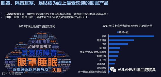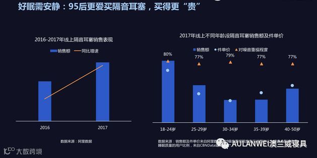 改善声音、温度、气味、床上舒适度、湿度等几大因素有助于睡眠。从阿里数据来看,眼罩尤其是能够在光、热、湿度等几个方面发挥作用的蒸汽眼罩,销售增速最快。此外,隔音耳塞的销量在近几年涨幅明显, 95后就最爱买隔音耳塞,买得也最贵。