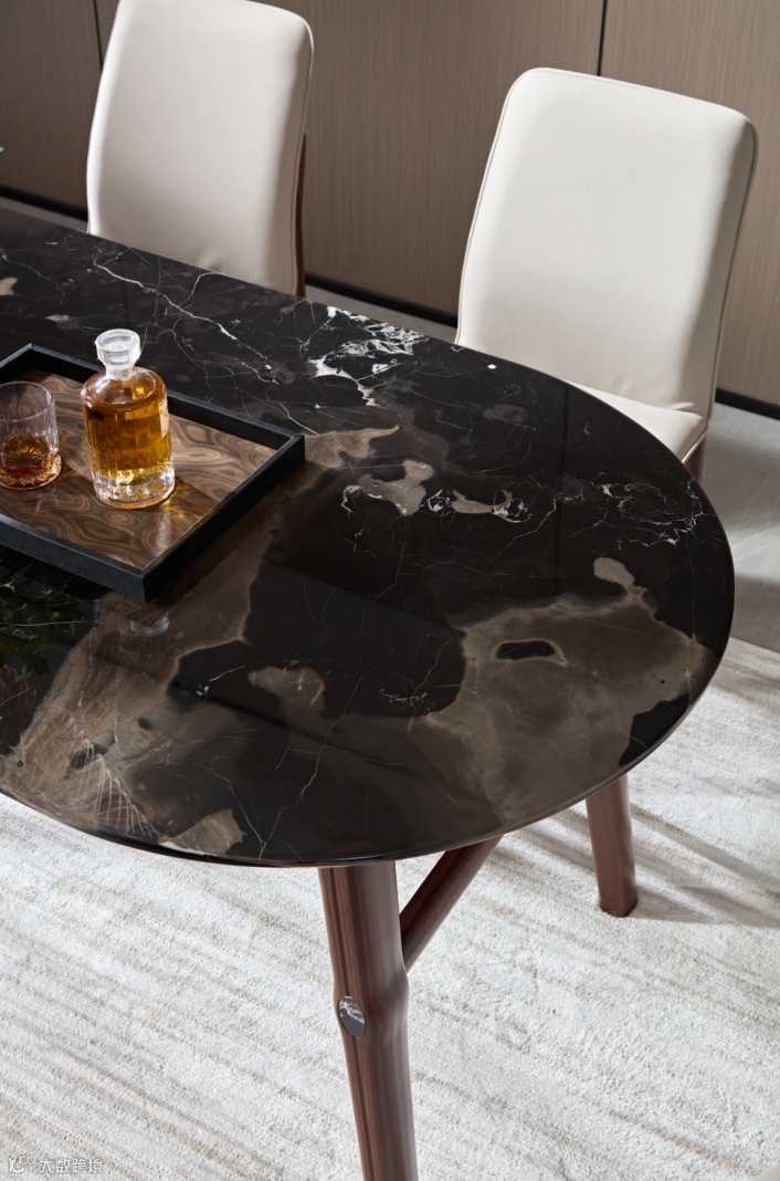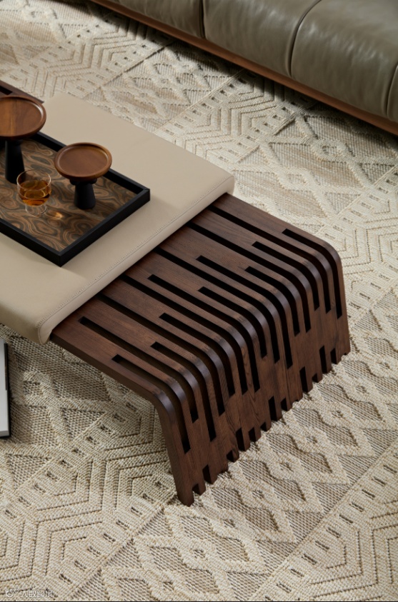 精湛的加工工艺、极致考究的细节处理,多面的切割工艺把黑胡桃木的自然之美表现得淋漓尽致,再加以时尚简约的软体搭配,一种动与静、刚与柔的空间搭配恰到好处的呈现。