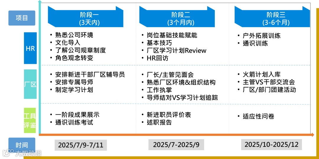 第一阶段是入职开始的前三天,即7.9-7.11。将进行一系列的课程、拓展及活动,激发新进干部的创新思维与团队协作能力,帮助新进干部快速适应新环境,融入部门团队。