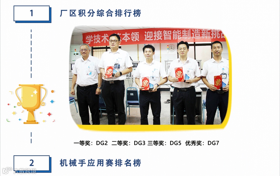 参赛选手全力以赴、争分夺秒,两个环节的比赛经过激烈角逐,二厂袁嘉辉、廖熊达队干净利落、以收刀入鞘般的气势摘得机械手应用赛的桂冠;三厂王春波、谭石文队沉着冷静、以一丝不苟的态度率先完成比赛,荣登故障诊断与排除赛榜首!本次大赛采用积分制设置厂区综合排名榜,获得比赛第一名的选手所在厂区积100分,第二名积90分,第三名积80分,以此类推,所有积分累加形成厂区综合排名,最终二厂以530的高分名列第一!