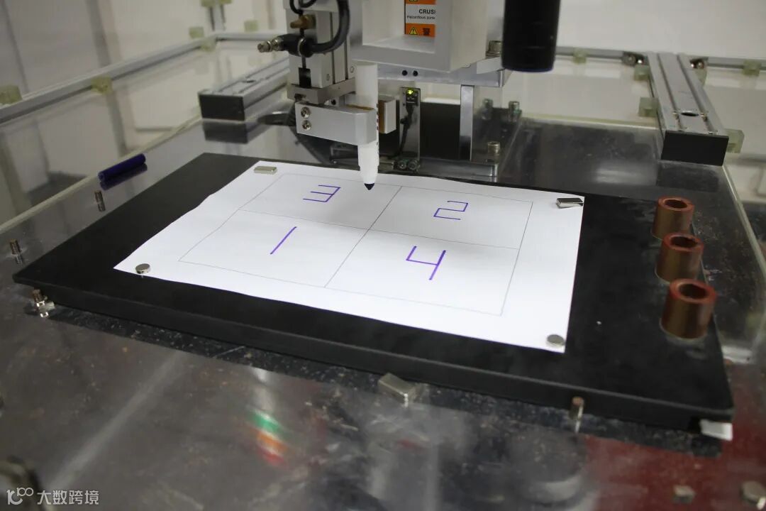 机械手应用赛考察选手程序逻辑设计、智能设备校点、指令发送等能力,两人分工合作,一人负责程序设计,一人负责机器人校点,利用平台视觉识别题目数字顺序,并把数字顺序传递给机器人,以面向人机的视角,机器人抓笔在空白纸上按收到的顺序写出这四个数字,裁判从24种组合方式中任意抽取一种数列进行验证,机器根据视觉识别的结果进行书写,数字完全正确即答题准确!