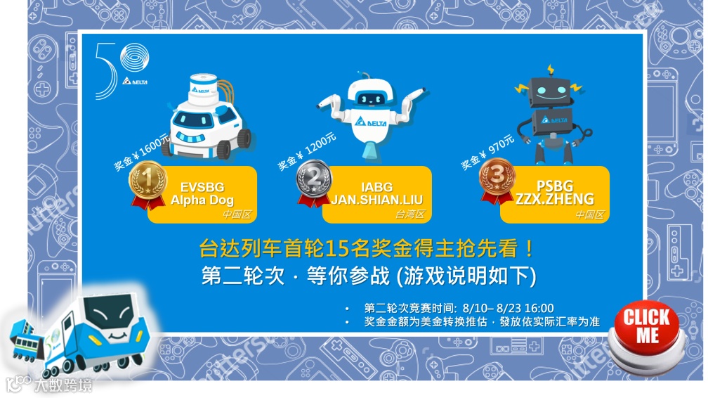 台达时光列车为公司庆祝创立50周年而设计的专属小游戏,一共分为七关,每一关代表台达发展演进历史,进入全球15名 ,就能拿高额奖金!第二轮次正在火热比拼中,等您来战!