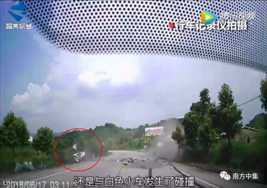 关于事故经过,笔者从韶关市广播电视台的新闻视频中看到:事发地点有一处弯道,一辆白色小汽车在经过弯道时驶向了对面的车道,与正在对面车道上正常行驶的一辆重型半挂牵引车发生了猛烈碰撞,小汽车被撞后旋转半圈冲出路面,车头朝下悬停在路边的斜坡中。