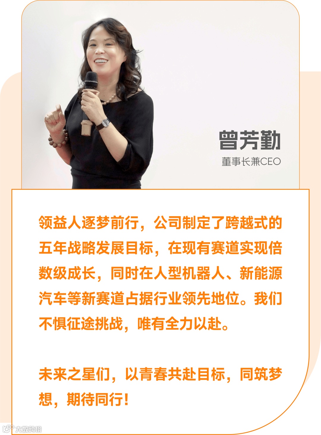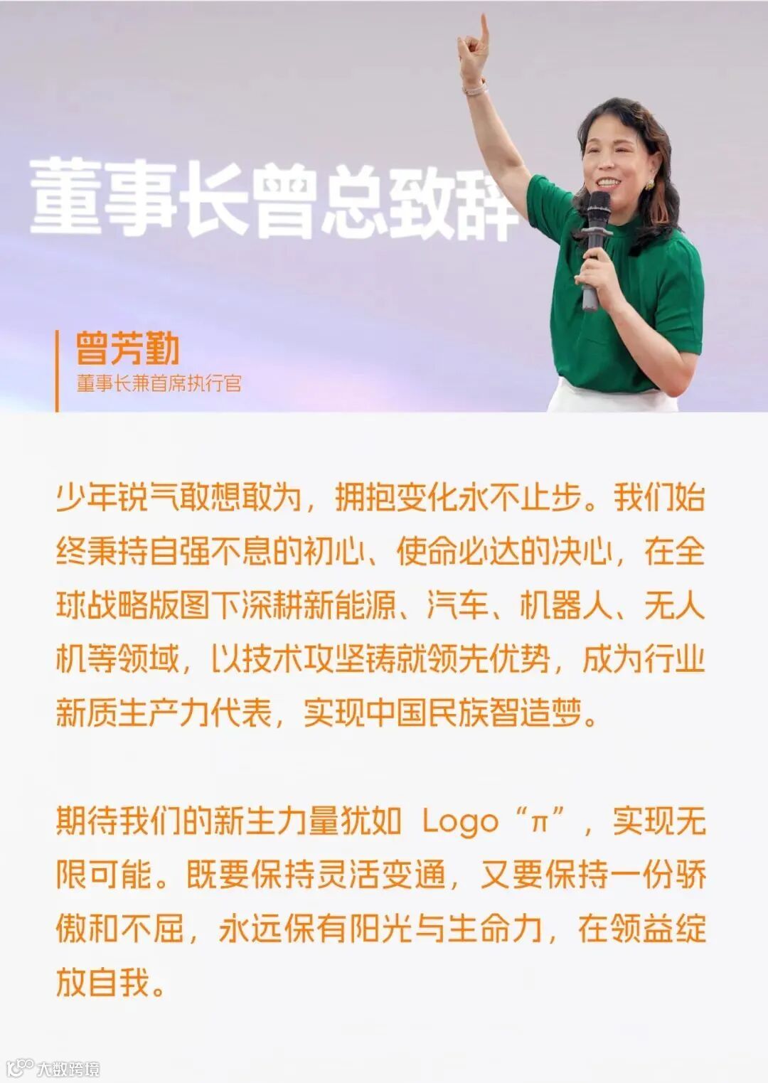 开营仪式上,董事长曾芳勤女士站在初心的光泽里,她的寄语如晨星点亮希望:“期待我们的新生力量犹如Logo π,实现无限可能”。