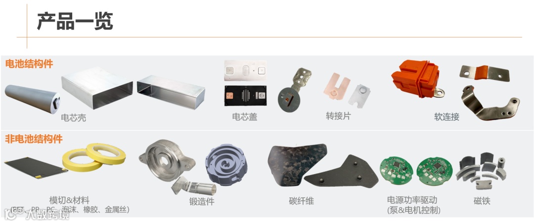 基于AI终端硬件领域累积的精密制造和研发设计能力,公司建立了独特的竞争优势。目前,公司已布局动力电池结构件产品,包括方壳、电芯钢/铝外壳、圆柱电芯铝壳、顶盖、盖板、防爆阀、正负极软连接、转接片等,以及柔性软连接母排、注塑件等汽车相关精密结构件。这些组件用于传输能量、承载电解液、保护安全性、固定支承电池和外观装饰,并具备可连接性、抗震性、散热性、防腐蚀性、防干扰性和抗静电性等功能。