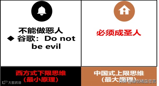 美国谷歌公司著名的理念“Do not be evil永不作恶”则是典型的表达,这正是最小原理的下限思维;反观我们的理念,则是“必做圣人”,这是最大原理的上限思维。