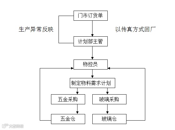 1.计划部资料员负责接收门市生产计划单传真件,负责与门市核对、沟通生产计划单的相关事项,负责将生产计划单传真件传递给物控员做物料需求计划。根据门市生产计划单汇总表提供给计划员制作生产计划。