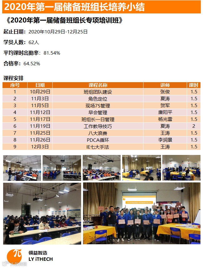 “我宣布,2020年第一届储备班组长培训圆满结束,祝愿大家未来可期!”随着,人力资源部夏涛经理总结演讲结束,纵贯10、11、12月的储备班组长培训,于12月25日正式落下帷幕。 第一届储备班组长培训共设9节课,邀请各部门优秀讲师,分别从班组建设、现场管理、沟通技巧等方面进行授课。 |