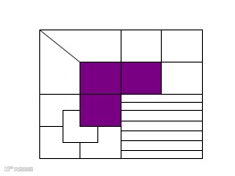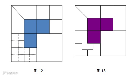 沈老师先要求学员将图11中的①分成形状相同的二等份,将②分成形状相同的三等份,学员们很快就做到了,如图12所示。沈老师再要求大家将③分成形状相同的四等份。这个问题有难度,学员们想了一些办法,做出来的还是很少。沈老师就带着大家先将③分成大小形状相同的12等份,然后根据12÷4=3,将每3个等份组合起来,形成了图13所示的4等份。沈老师的第四个题目是将图中的④分成大小形状相同的七等份。学员们冥思苦想了很久,都未能找到答案。有的人将④用虚线分成了56等份,然后来组合,当然答案是错的。其实,这个答案很简单,如图14所示。