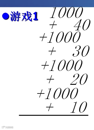 沈老师问台下的学员1000加40是多少?大家得出1040后,他又问1040加1000是多少?大家回答2040。他再接着问加30是多少?学员们回答是2070.他又问再加1000是多少?学员们回答3070。他接着问加20是多少?学员们回答3090。他又问再加1000是多少?学员们答4090。沈老师问得一次比一次快,台下的学员也一次比一次回答得快。当加到4090的时候,沈老师问4090加10是多少?很多学员马上喊出5000。